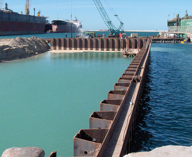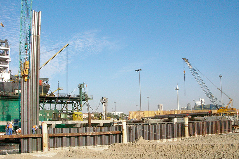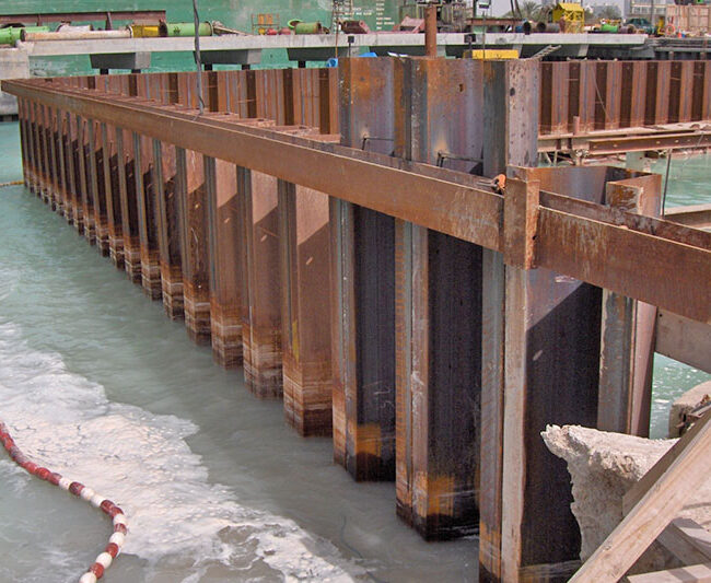 Sheet Pile Walls are thin retaining walls which are constructed to provide temporary or permanent lateral earth, water or other fill material retention. They are commonly used for excavation shoring, waterfront structures, cofferdams, riverbank protection or protection of foundations from water damage. Steel sheet piles are most commonly used and can be fabricated in several shapes.